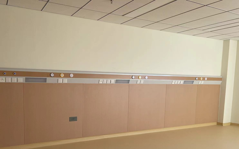 普通房间床头安装铝合金设备带,配有氧气和吸引端口、电源插座及床头照明设备。