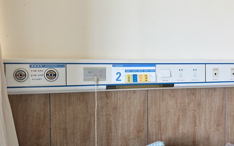 普通病房为两人间和三人间,每个床头安装医用气体设备带,分别配置一个氧气终端、一个吸引终端、一个呼叫器、阅读灯、两个电源插座以及网络信息接口。