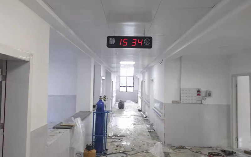 护士站选用50路呼叫系统主机,可与病房呼叫器分机双向呼叫,语音对讲通话。走廊安装双面呼叫系统显示屏,有病员呼叫的时候显示分机号码,空闲的时候显示万年历。