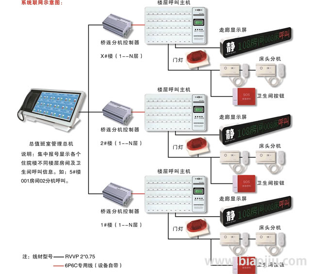 实现功能:主机分机互呼和语音通话对讲,可在主机上自编设置3位数房间号和2位数床号,三种等级护理,系统广播音乐播放、三色门灯、卫生间紧急呼叫等实用功能。