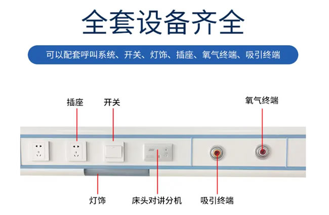 端口(床位)数量 | 管道与管道设备、病房设备带、气体终端、呼叫对讲系统、配电照明 | |||