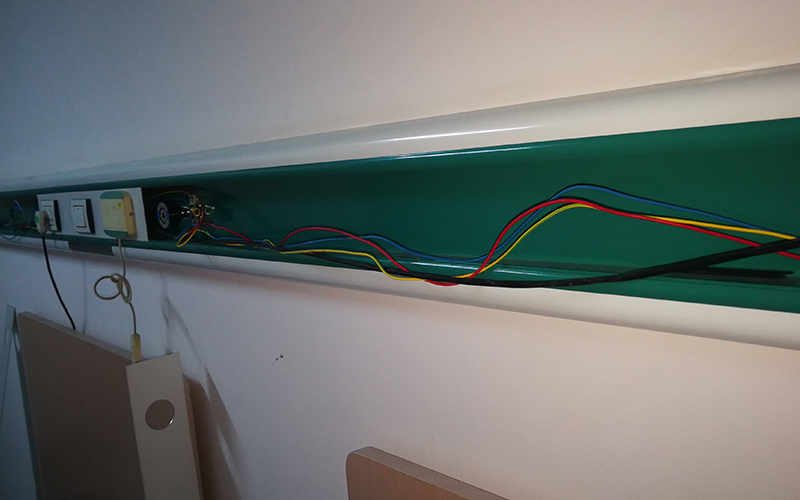 3、为了安装简单美观,一般每个房间的引入管都是从天花板内的水平管道引出的,从引出端到进入设备带的部分管道外用铝合金盖覆盖;铝合金设备带安装了氧气、气体截止阀、吸引力、压缩空气管道和快速插座,快速插座一般离地1.4m;