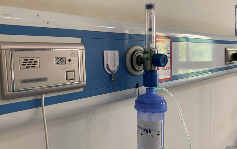 病房床头安装铝合金设备带,氧气管道隐藏在其中,每个床头安装氧气快速插座,可以用湿化瓶连接吸氧。湿化瓶里会装纯净水,通过水湿化吸入使用时避免干燥不适。