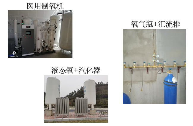 氧气站房设备:中大型医疗结构可选用五立方液态氧储罐通过汽化器设备将液态氧转换成气态氧供氧。或者不同规格的分子筛医用制氧机供氧,一般分为每小时3m³至60m³制氧量不同规格的制氧机。中小型用氧量不高的小型医疗机构和医养结合的养老院也可以选用多个40升氧气瓶连接集中供氧,和三立方、五立方的小型医用制氧机供氧。