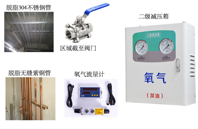 医用氧气管道:医院中心吸氧系统管道根据行业技术规范可采用脱脂无缝铜管和脱脂304不锈钢管,在氧气站房和每个楼层病区的区域设置阀门方便后期检修。在每个病区根据需要还应该设置二级减压箱,作用是预防一级减压装置故障,保障病房氧气管道压力始终为低压状态。根据需要还可以设置氧气质量流量计,方便核算每个区域的氧气使用量。