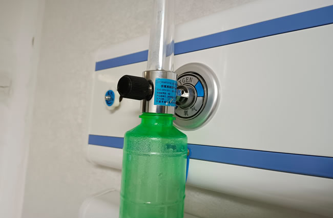 病房床头吸氧设备:氧气由氧气供应室通过管道及管道设备减压稳压处理后输送到病房床头和各用氧点,至病房的氧气压力一般为0.4MPa左右,在病房床头安装自封式氧气终端,连接快插式氧气湿化瓶就可以使用了,至此一套完整的医院中心吸氧系统装置就完成了。