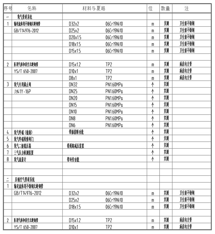 9.  医气管道主干管均采用输送流体用不锈钢管,进入病房内的支管均采用铜管。